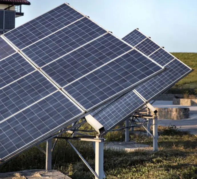 Estructuras para paneles solares y cableado aéreo.